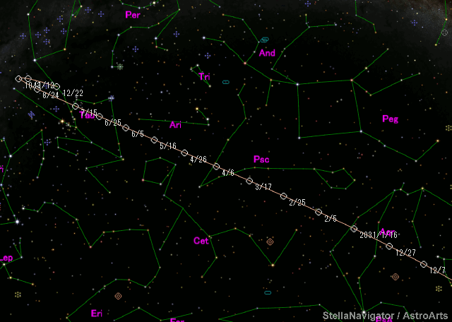 Perturbed ephemeris below is based on elements from MPEC 2025-YF1. Epoch (TT/JD) T (TT/JD) Peri. Node Incl. 2462760.50000 2462757.0628129 251.76089 65.89560 5.82061 e q a Epoch (TT) 0.4344028 1.9621839 3.46922 2030/09/16.00