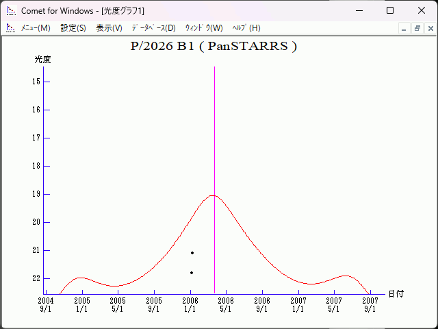 Epoch = 2006 Mar. 6.0 TT T = 2006 Mar. 21.93340 TT Peri. = 69.52902 e = 0.3319542 Node = 106.95466 2000.0 q = 2.3978932 AU Incl. = 4.08237 a = 3.5894144 AU n = 0.14493346 P = 6.80 years