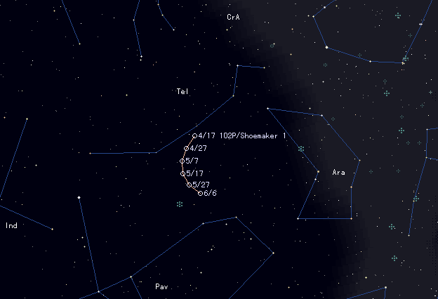 | 102P/Shoemaker 1 [Finding Chart] , which will pass the perihelion in March 1999, has never observed yet in this return. But the ephemeris says the comet is already bright as 16-17 mag. Because the comet is in the southern sky, Northern people cannot observe it. But it locates high in the morning in the Southern Hemisphere. It moves southwards from Telescopium to Pavo this month. It closes to a globular cluster NGC 6752(5.4 mag, 20') in late May. The condition of this comet before perihelion passage is bad in the Northern Hemisphere. Only in November, it will appear in the very low evening sky. However, the comet is 15 mag and the altitude is less than 15 deg, so the observation will be extremely hard. After perihelion passage, it appears at dawn as 15 mag in July 1999. Then we can continue to observe it while it fades out gradually. |