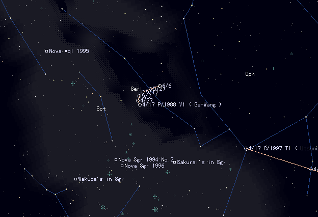 | P/1988 V1 ( Ge-Wang ) [Finding Chart] is in its first return. Now is the good chance to recover it. It locates in Serpens (tail) and transits meridian after midnight. The ephemeris says it is already 19 mag. However, the comet is in the Milky Way, so the recovery may be troublesome. The comet will pass the perihelion in June 1999. It will be at opposition in summer and autumn in 1999 and reach to 15 mag. |