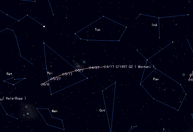 55P/Tempel-Tuttle has gone and no bright comets are in the sky. The best one of this month is C/1997 J2 ( Meunier-Dupouy ), getting higher in the morning, but not so bright, about 11 mag. 69P/Taylor has bursted out and reached to 11 mag at the peak. Although it is now fading out, it is still as bright as 13 mag. 62P/Tsuchinshan 1 has brightened more than expected. It is about 13 mag, too. Both are in the evening sky. C/1995 O1 ( Hale-Bopp ) in the southern sky has been fading out gradually and reached to 9.0 mag in late March.