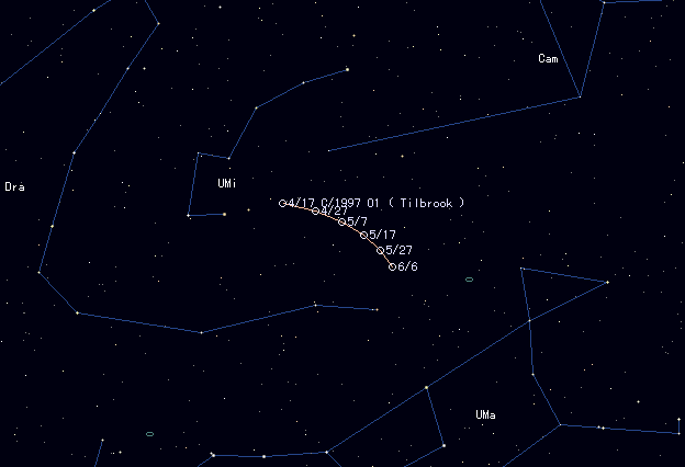 | C/1997 O1 ( Tilbrook ) [Finding Chart] was observed as 15 mag on Dec. 4, 17-18 mag from January to March. They are a bit brighter than expected. So it may be a bit brighter than ephemeris says still now. However, the comet has been quite diffused, so the observation will be very hard. It is between Ursa Minor and Ursa Major and locates in the evening northern sky. |