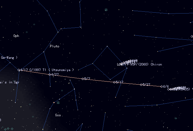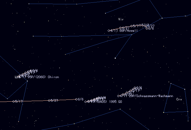 | 95P/(2060) Chiron [Finding Chart] , also registered as an asteroid (2060), is still north of alpha-Lib. It is at opposition and locates in the south at midnight. It will be about 15.5 mag. But the recent observations reported that the actual brightness is about 1-1.5 mag fainter than expected. It has passed the perihelion in 1996 February. But the perihelion distance is so large and the magnitude will never change so much for more several years. The altitude of the comet is now low in the Northern Hemisphere, less than 40 deg. This situation will continue for a while. |