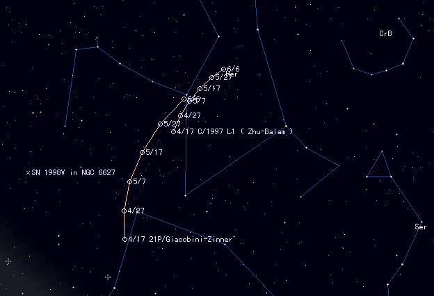 | 21P/Giacobini-Zinner [Finding Chart] , which passes the perihelion on Nov. 21, was observed as 22 mag on Jan. 20. It is getting brighter after that, 19 mag in early April. Although it is faint as 18 mag in April, it will be 16 mag in May and within range of amateurs' CCD. It will be brighter than 14 mag in August, then reaches to 10 mag in autumn and winter and observed visually in the evening. This comet is also a mother of Giacobinid meteor shower in October. Usually the shower does not appear at all, but a great appearance is expected in next October caused by the return of this comet. The previous chance was in 1985, when many observers did not believe it, but a sudden great appearance happened in Japan and surprised them so much. How about this time? The comet moves northwards from Ophiucus to Hercules. It transits meridian after midnight and locates overhead. |