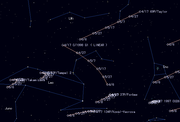 | C/1998 G1 ( LINEAR ) [Finding Chart] is a new comet discovered on Apr. 2 as 18.9 mag under the NEO survey at the Lincoln Laboratory. The name of this comet stands for the Lincoln Laboratory Near-Earth Asteroid Research. It was reported as one of the fast moving asteroids at first. But the motion was comet-like, moving on a retrograde parabolic orbit. Then the tail of this object was detected and it turned to be a comet. However, the coma was not detected. The situation is very similar to that of 133P/Elst-Pizaarro, registered as both a comet and an asteroid. Comet LINEAR passes the perihelion on Oct. 15, but reaches to 17-18 mag at best. It moves southwestwards in Leo's head. It locates in the southwest at dusk as 18 mag. |