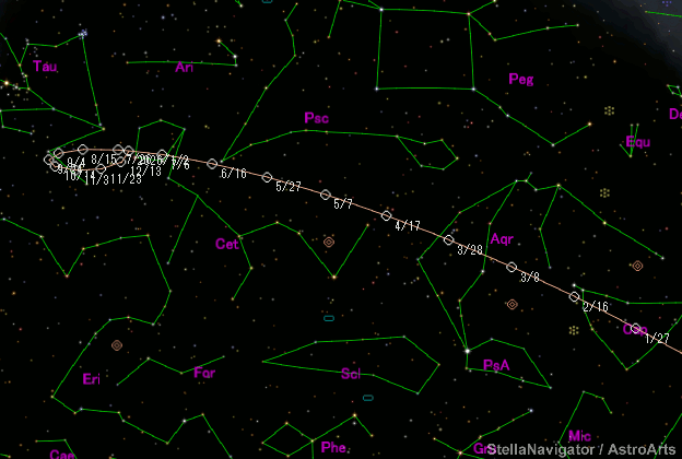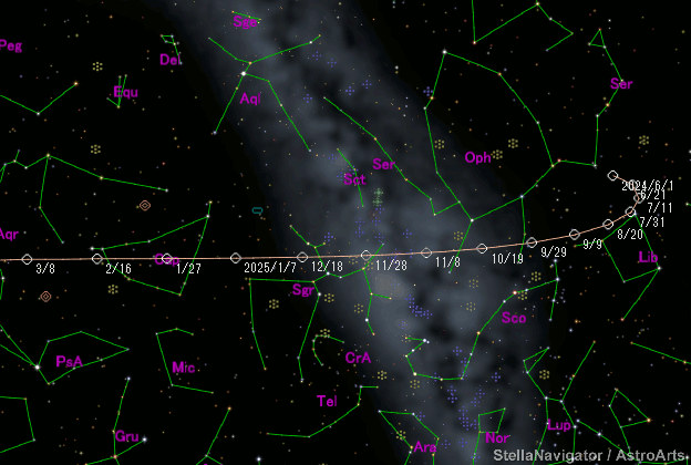 Epoch 2025 May 5.0 TT = JDT 2460800.5 T 2025 Mar. 2.63973 TT Pike q 2.0065823 (2000.0) P Q n 0.15057499 Peri. 216.77301 +0.82441586 +0.53002401 a 3.4991896 Node 110.06410 -0.45580942 +0.82968856 e 0.4265580 Incl. 12.20174 -0.33552387 +0.17518974 P 6.55 From 1063 observations 2018 Feb. 16-2025 Aug. 5, mean residual 0".6. Nongravitational parameters A1 = +0.37, A2 = +0.0473.