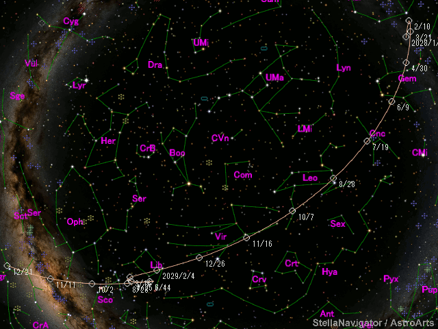 Perturbed ephemeris below is based on elements from MPEC 2023-VM5. Epoch (TT/JD) T (TT/JD) Peri. Node Incl. 2462160.50000 2462153.1878938 173.12146 20.96345 3.60569 e q a Epoch (TT) 0.3722132 2.1885579 3.48615 2029/01/24.00