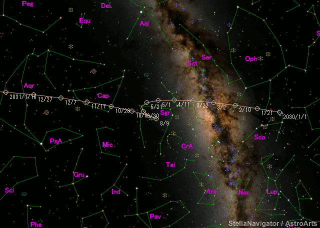 Perturbed ephemeris below is based on elements from MPEC 2025-YF1. Epoch (TT/JD) T (TT/JD) Peri. Node Incl. 2462760.50000 2462757.0628129 251.76089 65.89560 5.82061 e q a Epoch (TT) 0.4344028 1.9621839 3.46922 2030/09/16.00