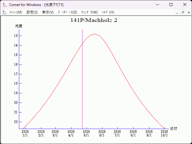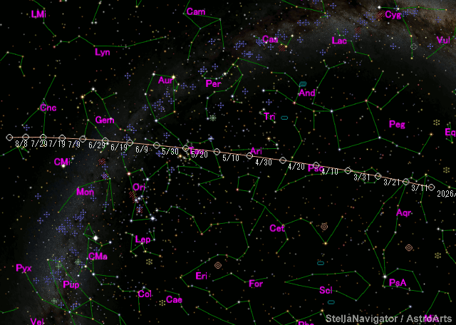 Perturbed ephemeris below is based on elements from MPEC 2022-K19. Epoch (TT/JD) T (TT/JD) Peri. Node Incl. 2461160.50000 2461153.5674823 153.65108 241.77123 13.96029 e q a Epoch (TT) 0.7358142 0.8074632 3.05642 2026/04/30.00