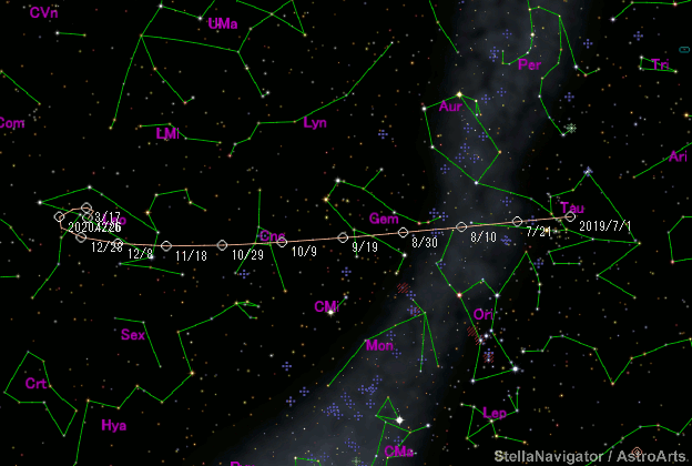 Perturbed ephemeris below is based on elements from MPEC 2020-SI8. Epoch (TT/JD) T (TT/JD) Peri. Node Incl. 2458800.50000 2458802.5176698 14.66547 97.19807 6.39594 e q a Epoch (TT) 0.7265799 1.8018437 6.59002 2019/11/13.00