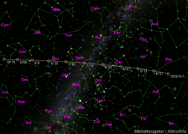 Perturbed ephemeris below is based on elements from MPEC 2021-L04. Epoch (TT/JD) T (TT/JD) Peri. Node Incl. 2461240.50000 2461229.4535220 320.30661 127.40674 11.02842 e q a Epoch (TT) 0.5837824 1.3000703 3.12354 2026/07/19.00