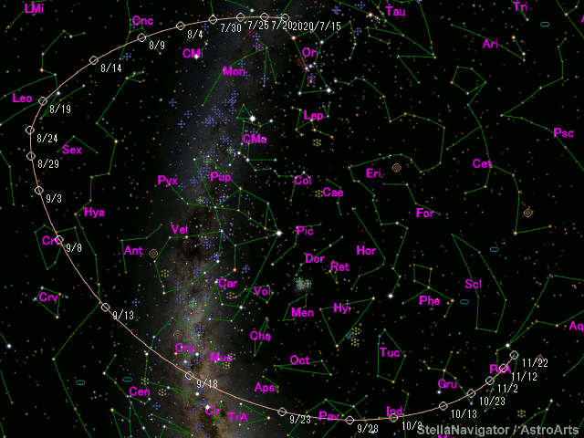 The orbital elements are calculated using the Minor Planet & Comet Ephemeris Service.