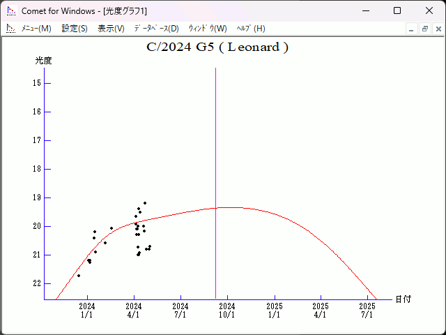 Epoch 2024 Mar. 31.0 TT = JDT 2460400.5 T 2024 Sept. 6.98478 TT Rudenko q 2.9529125 (2000.0) P Q z +0.0018833 Peri. 209.55729 -0.84680943 -0.02523943 +/-0.0000138 Node 316.39882 +0.49259955 -0.41401957 e 0.9944387 Incl. 50.39019 -0.20064761 -0.90991800 >From 92 observations 2023 Dec. 15-2024 May 5, mean residual 0".4.