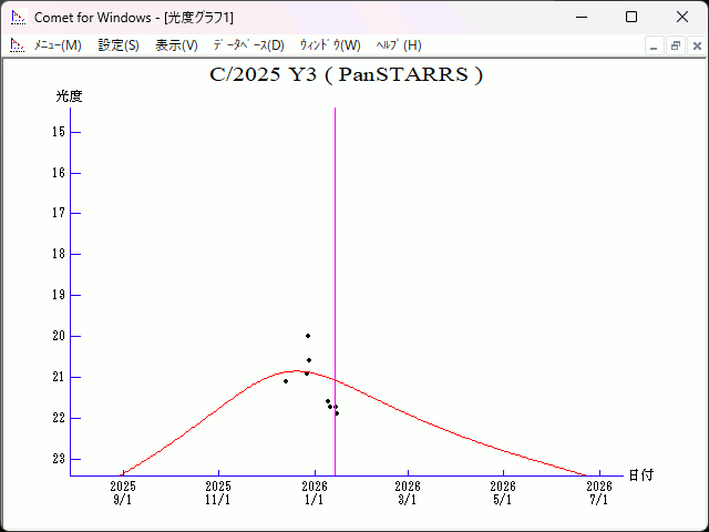 Epoch 2025 Nov. 21.0 TT = JDT 2461000.5 T 2026 Jan. 13.70289 TT Pike q 2.2273067 (2000.0) P Q z -0.0003873 Peri. 219.38381 -0.04499016 +0.02678138 +/-0.0004270 Node 272.96733 +0.96033279 -0.27422373 e 1.0008627 Incl. 89.54978 -0.27520325 -0.96129293 From 27 observations 2025 Dec. 13-2026 Jan. 15, mean residual 0".3.