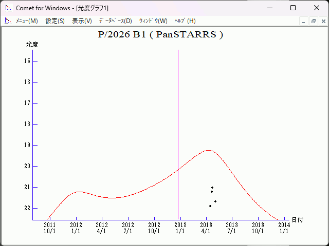 Epoch = 2012 Dec. 19.0 TT T = 2012 Dec. 22.79702 TT Peri. = 69.60530 e = 0.3399242 Node = 106.67334 2000.0 q = 2.3504316 AU Incl. = 4.09220 a = 3.5608511 AU n = 0.14668083 P = 6.72 years