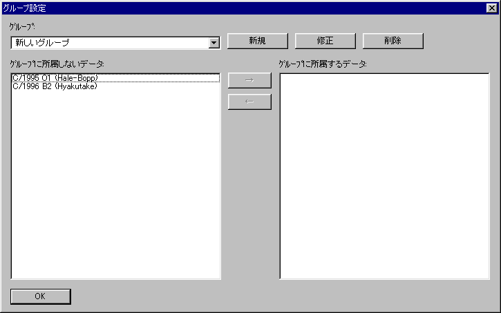 例えば、MPCフォーマットのファイルを読み込んで、彗星を追加する場合は、まず、メニューの「データベース」−「天体」を選んで、「データベース」ダイアログを開きます。 そこから「設定」ボタンを押して、「グループ設定」ダイアログを開いて、「新規」ボタンを押し、新しいグループを作成しておきます。 この時、「グループに所属するデータ」には、何も選ばないようにします。