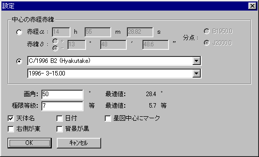 そして、メニューの「表示」−「設定」で、百武彗星の1996年3月15日の位置を選びます。 また、ここでは、画角を50°、極限等級を7等とします。