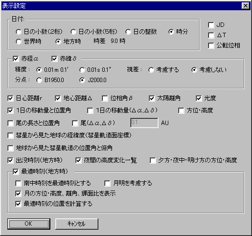 メニューの「表示」−「設定」を選び、「表示設定」ダイアログを開きます。 ここで様々に設定を行うことで、観測計画を立てるのに役立つ様々な情報を計算させることができます。