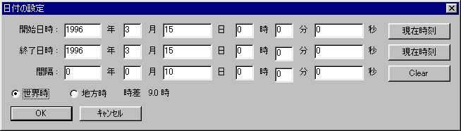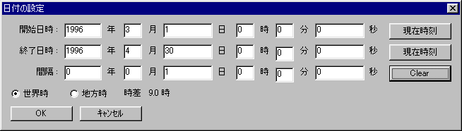 次に、メニューの「設定」−「日時」を選び、位置推算を行う日付を設定します。 ここでは1996年3月1日0時0分0秒から4月30日0時0分0秒まで、1日間隔で計算することにします。 「OK」を押すと、3月1日から4月1日までの、毎日の世界時0時の予報位置が表示されます。