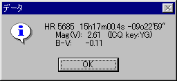 星図で星をクリックすると、天体名と光度が表示されます。