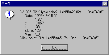 メニューの「設定」−「天体の選択」を選び、「C/1996 B2 (Hyakutake)」を選びます。 すると、今日現在の百武彗星の予報位置が画面に表示されます。