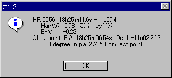 次に、星図の右端のスピカをクリックします。 すると、スピカの情報とともに、さきほどクリックした位置、つまり、百武彗星の頭部からの距離と方向角が表示されます。