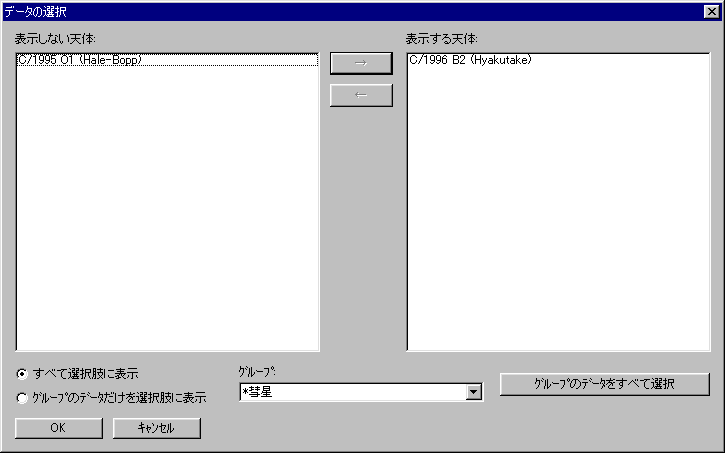 次に、メニューの「設定」−「天体の選択」を選び、「C/1996 B2 (Hyakutake)」を選びます。