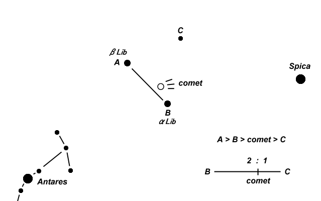 尾は、彗星の頭部からスピカに向かって伸びていましたので、尾の方向角は、275度となります。 尾の長さは、スピカまでの距離の8分の1でしたので、22.3度を8で割って、2.8度となります。
