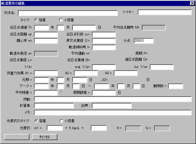 彗星の場合は「彗星」を、小惑星の場合は「小惑星」を選んでから、軌道要素を入力して下さい。