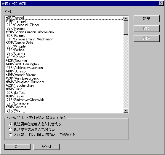 「OK」を押すと、新しい彗星が一覧に表示されます。 「OK」を押すと、データベースに追加されます。