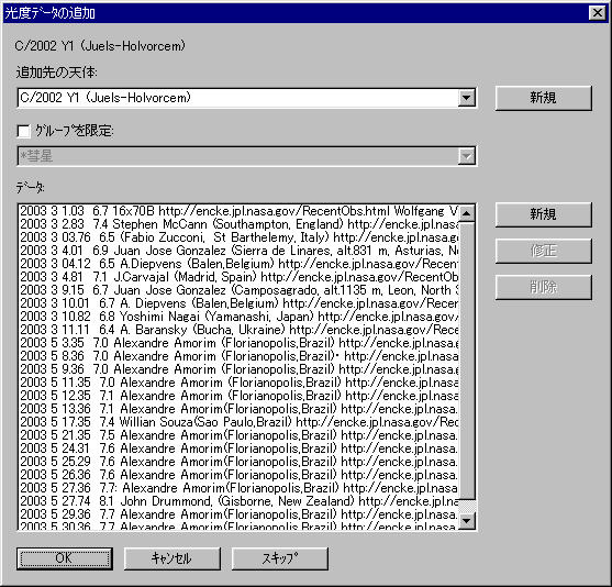 ある彗星の光度データだけはデータベースに追加しない、という場合は、「スキップ」を押して下さい。 読み込むのを途中でやめる場合は、「キャンセル」を押して下さい。